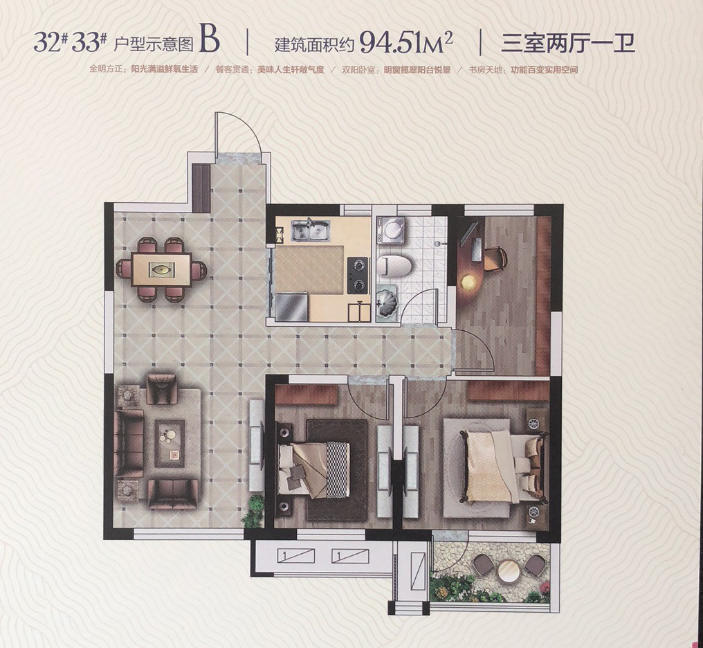 各个空间户型方正,方便室内家具布置;全明户型,各部分空间均有窗,可保证整体空间采光和通风,居住舒适度好;整体空间布局合理,能够保证动静分离和居室通风,方便使用;卧室厨卫等各个功能区的面积大小都比较合理,居住体验便利,整体舒适度高;