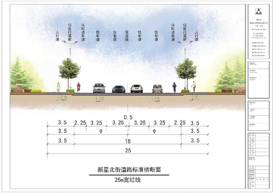 项目基本情况:规划道路红线宽25米,全长约720米。道路横断面设计采用一块板形式,车行道为双向4车道,设计行车速度为20千米/小时。