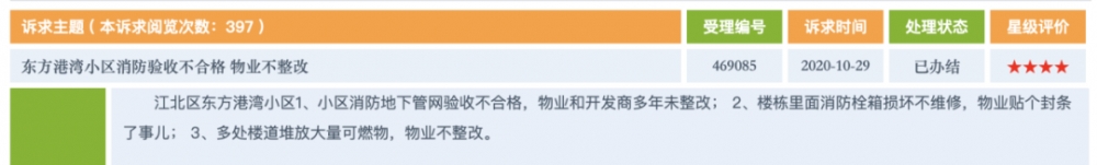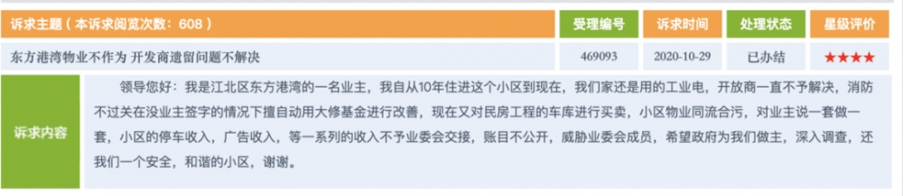 而早在2020年,就有业主投诉东方港湾富恒物业的不作为。还包括公共收益不予业委会交接,账目不明;擅自动用大修基金进行改善;对民房工程的车库进行买卖;楼栋里面消防栓箱损坏不维修,物业贴个封条了事儿等。