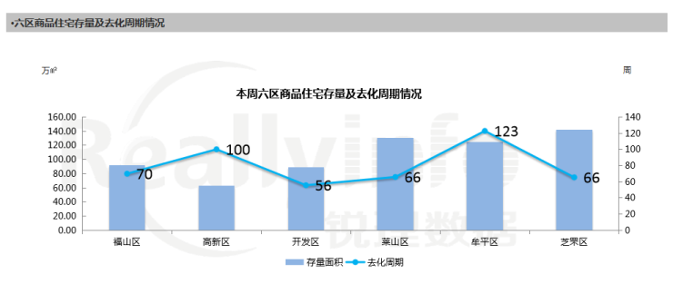 存量方面,芝罘存量142.43万㎡最多;莱山区130.54万㎡位居第二 ;去化周期方面,目前开发区去化周期较低,为56个周;牟平区去化周期123周,去化速度最慢。