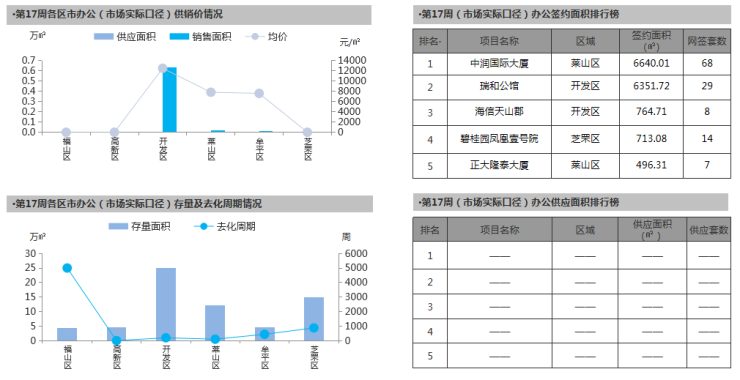 【区域市场】本周办公市场无新增供应;成交主要来自开发区;开发区存量较高,福山区去化周期最长;中润 国际大厦项目为周度办公市场销冠
