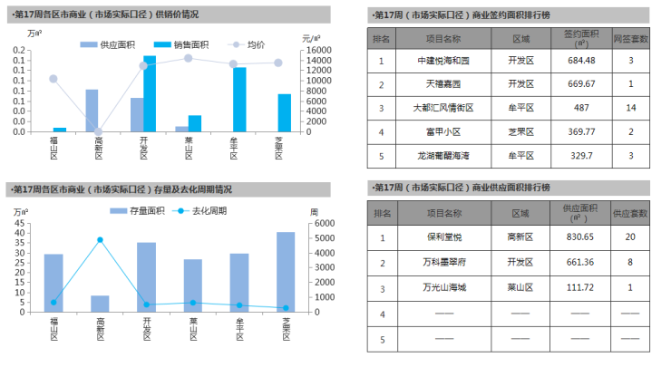 【区域市场】本周商业市场新增供应主要来自于高新区;销量主要来自于开发区;芝罘区存量较高,高新区去化周期最长;中建悦海和园项目为周度商业市场销冠