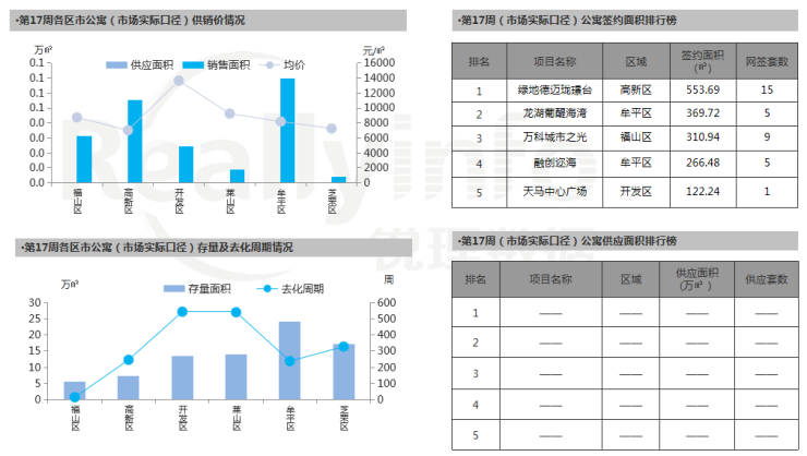 本周全市公寓市场无新增供应;签约40套,成交面积约0.19万㎡,环比下降38%;全市签约均价8677元/㎡,环比下降4.1%;截止到17周末公寓存量约1.34万套,面积约82.13万㎡,去化周期升至134周。