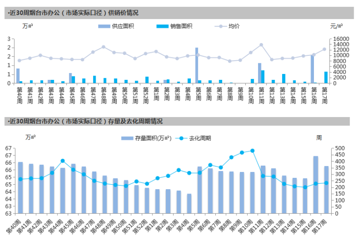 本周烟台六区办公市场无新增供应;签约34套,成交面积约0.67万㎡,成交面积环比上涨1372%;成交均价12295元/㎡,环比上涨19%;截止到本周末办公存量约5523套,面积约65.76万㎡,去化周期升至234周(约55个月)。