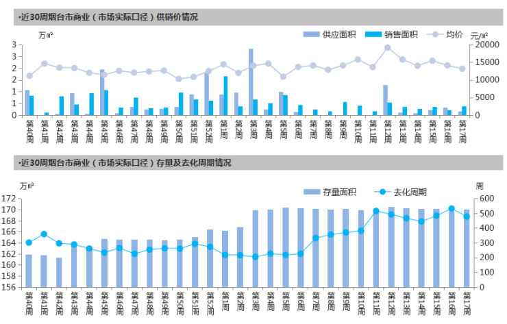 本周烟台六区商业市场新增供应0.16万㎡,环比减少50%;签约38套,成交面积约0.39万㎡,成交面积环比增加80%;烟台六区签约均价13247元/㎡,环比下跌7%;截止到本周末商业存量约1.22万套,面积约170.08万㎡,去化周期降至480周(约112个月)。