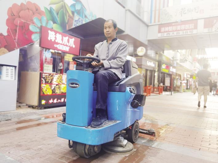 6日下午6点,保洁师傅宋宪金正驾驶洗地车在来回清洗地面,他告诉记者,他将一直工作到晚上10点。夏季到来后,万达金街安排洗地机每天循环清洗地面,还每周安排高压清洗机对地面进行整体冲刷。