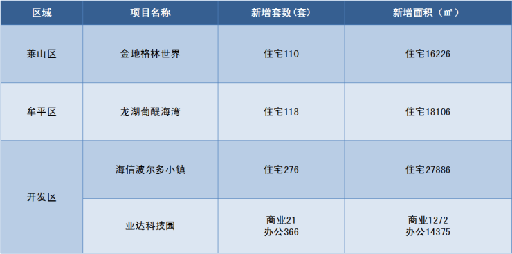 本周六区新增供应来自:莱山区·金地格林世界新增供应110套;牟平区·龙湖葡醍海湾新增供应118套;开发区·海信波尔多小镇新增供应276套,业达科技园新增供应387套。