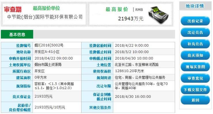 “红五月”开局,烟台土地市场首拍落地。[2018]5002号开发区A-41小区由中节能(烟台)国际节能环保有限公司21943万元摘得,溢价率0.05%,成交楼面价853元/平,用于建设山东省重点项目——烟台国际节能环保科技园。