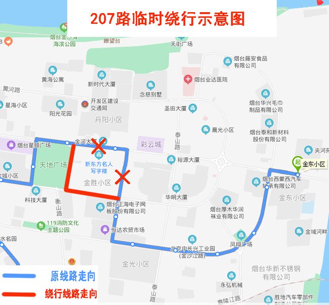 207路由金东小区发车,沿原路线行至黄山路与珠江路交叉口左转,沿珠江路、香山路行至香山路与长江路交叉口左转恢复原线路。