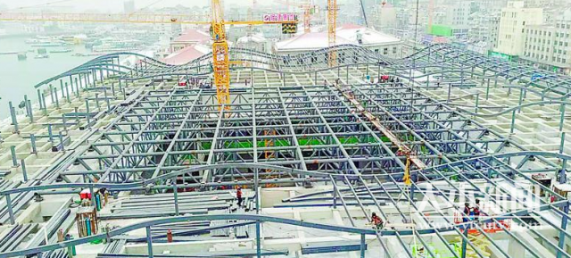 “这个就是芝罘湾广场的渔市综合体,也就是咱老百姓说的‘大渔市’,它的建筑面积一共是1.5万平方米,分两层,是集采购、娱乐一体化的综合商业体,建筑共两层,回字形中空设计,内部为钢结构桁架和玻璃采光井。外饰面为干挂石材和铝板。”芝罘湾项目主任工程师姜瑞浩介绍,整个渔市上面的波浪型屋顶全部为预制的钢结构,单品桁架重达18吨,跨度45米的空间桁架,吊装采用500吨汽车吊现场吊装,钢架构吊装已完成,钢柱安装完毕,钢梁正在施工。