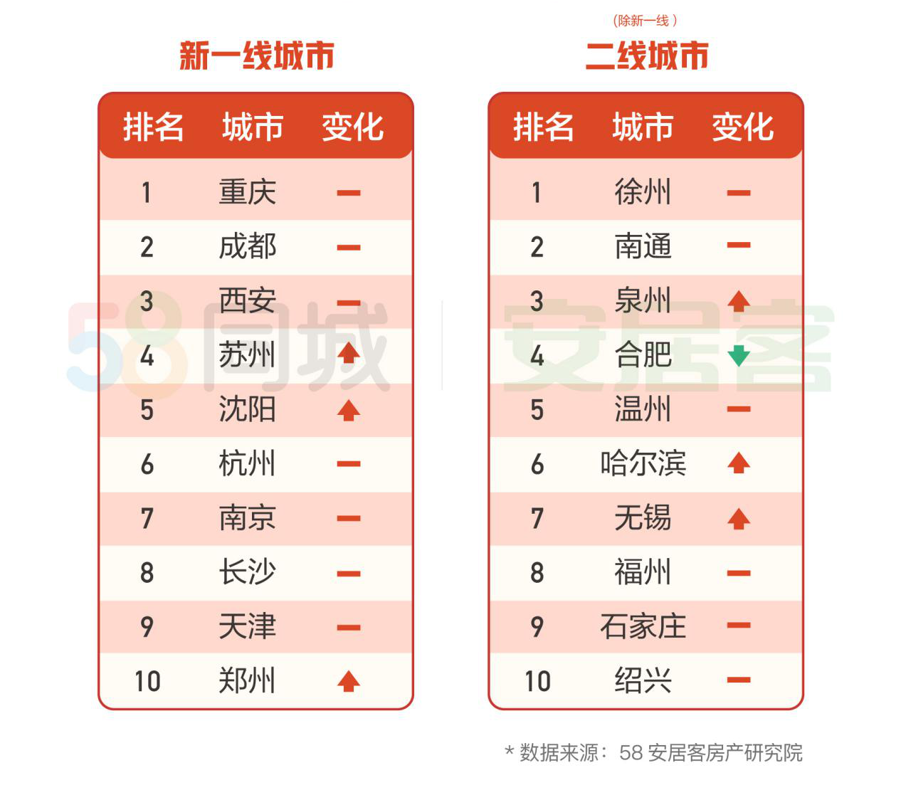 此外,58同城、安居客对二线城市(除新一线城市)、三线城市的置业热度做了全面调研。平台监测数据显示,在二线城市中,徐州、南通返乡置业热度依然居首,泉州、哈尔滨、无锡返乡置业热度排名上涨;在三线城市中,盐城、安庆、淮安成返乡置业热门城市前三名。