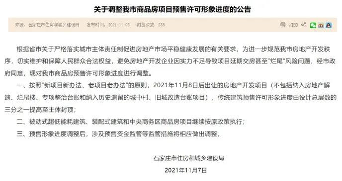 11月8日,石家庄市住房和城乡建设局正式发布《关于调整石家庄市商品房项目预售许可形象进度的公告》。