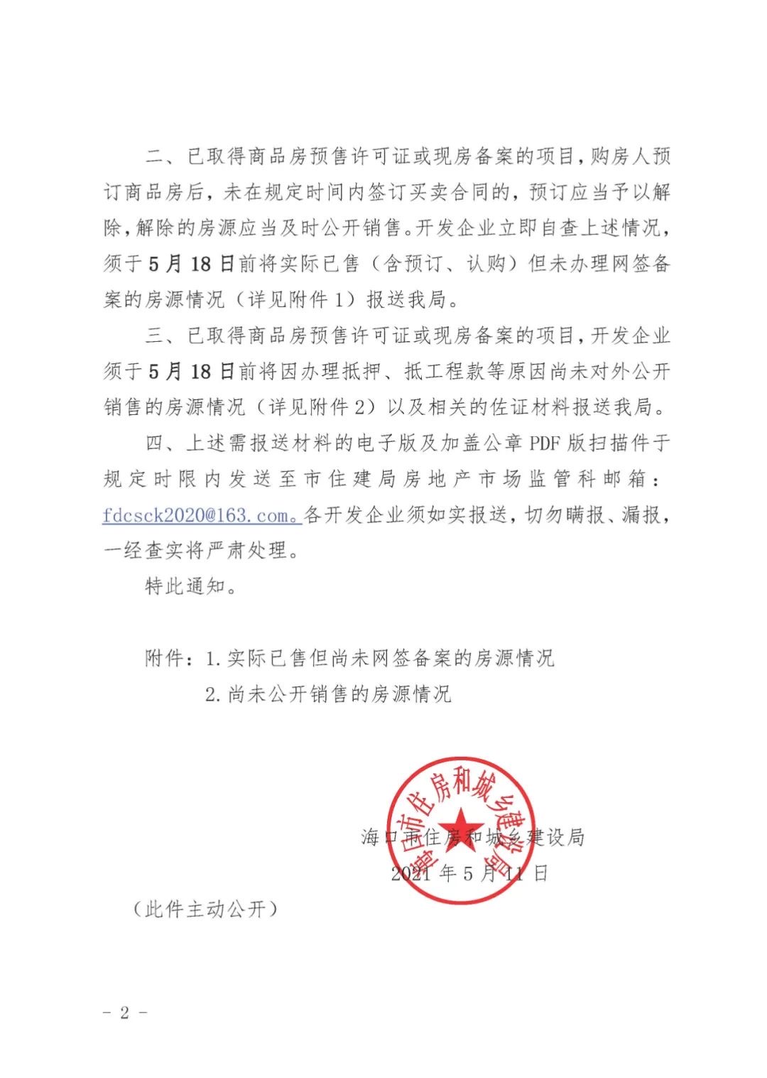 海口市住建局要求开发企业立即自查上述情况,须于5月18日前将实际已售(含预订、认购)但未办理网签备案的房源情况报送海口住建局。