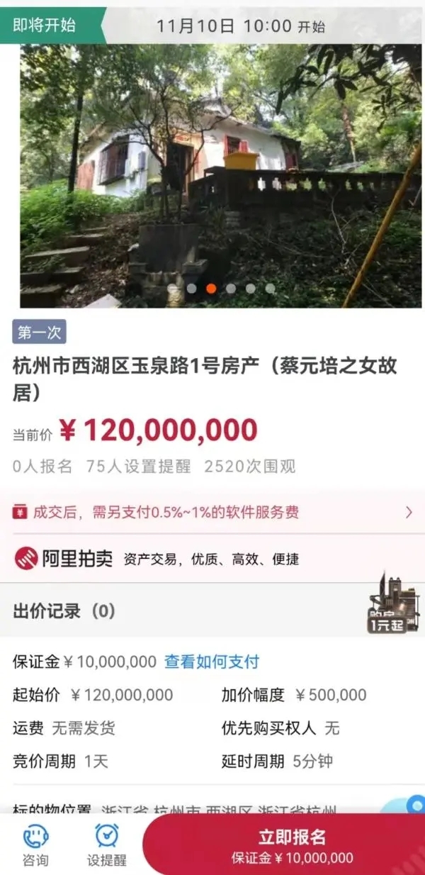 蔡元培女儿蔡威廉在杭州西湖边的故居,以1.2亿元起拍价挂上阿里拍卖,将于11月10日开拍。
