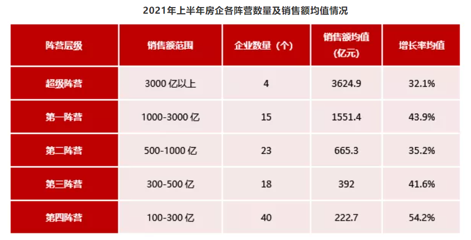 按照不同梯队来看,排名前列阵营(1000亿-3000亿元)共15家,精准把握长三角等热点城市群发展机遇,紧跟市场节奏大力推盘,销售额增长率均值为43.9%;第二阵营(500亿-1000亿元)23家企业,销售额增长率均值为35.2%;第三阵营(300亿-500亿元)和第四阵营(100亿-300亿元)分别为18家和40家,销售额均值分别为392亿元和222.7亿元,同比分别增长41.6%和54.2%。
