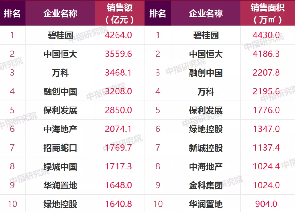 2021年上半年房企销售额和面积TOP10 数据来源:中指研究院
