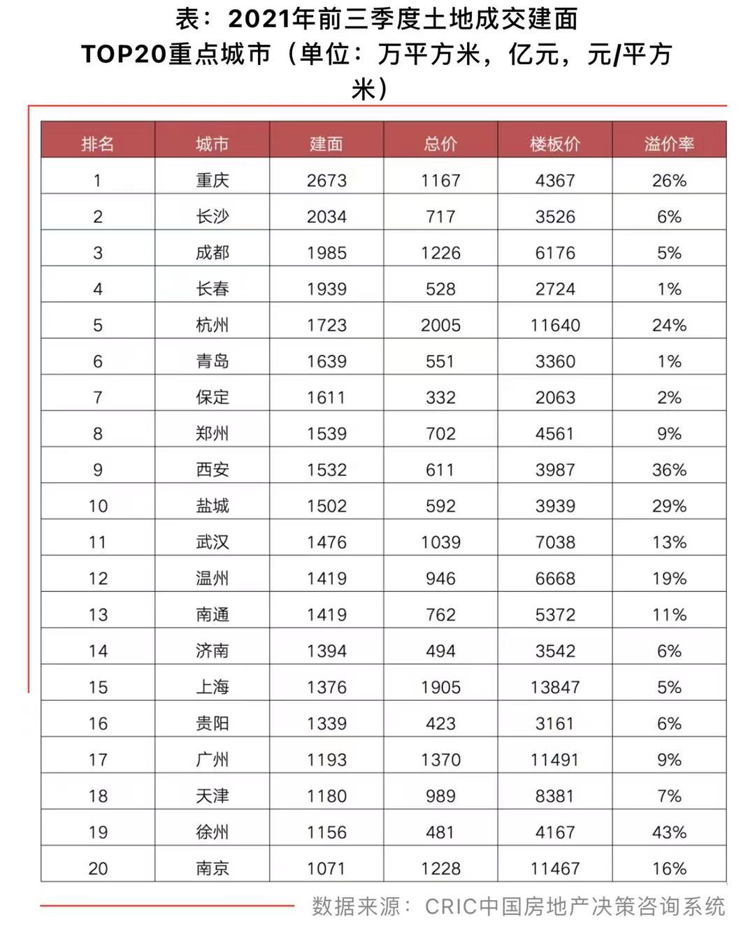 其中,溢价率超过20%的仅有5个城市,较二季度明显减少,其中徐州、盐城和杭州3城位于长三角。总体来看,三季度长三角土地市场热度高位回落。