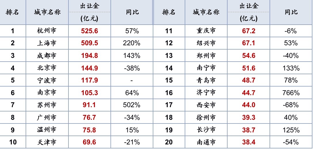全国300个城市成交楼面均价为2829元/平方米,环比增加23%,同比上涨17%;其中住宅类用地(含住宅用地及包含住宅用地的综合性用地)成交楼面均价为5759元/平方米,环比增加48%,同比上涨36%。