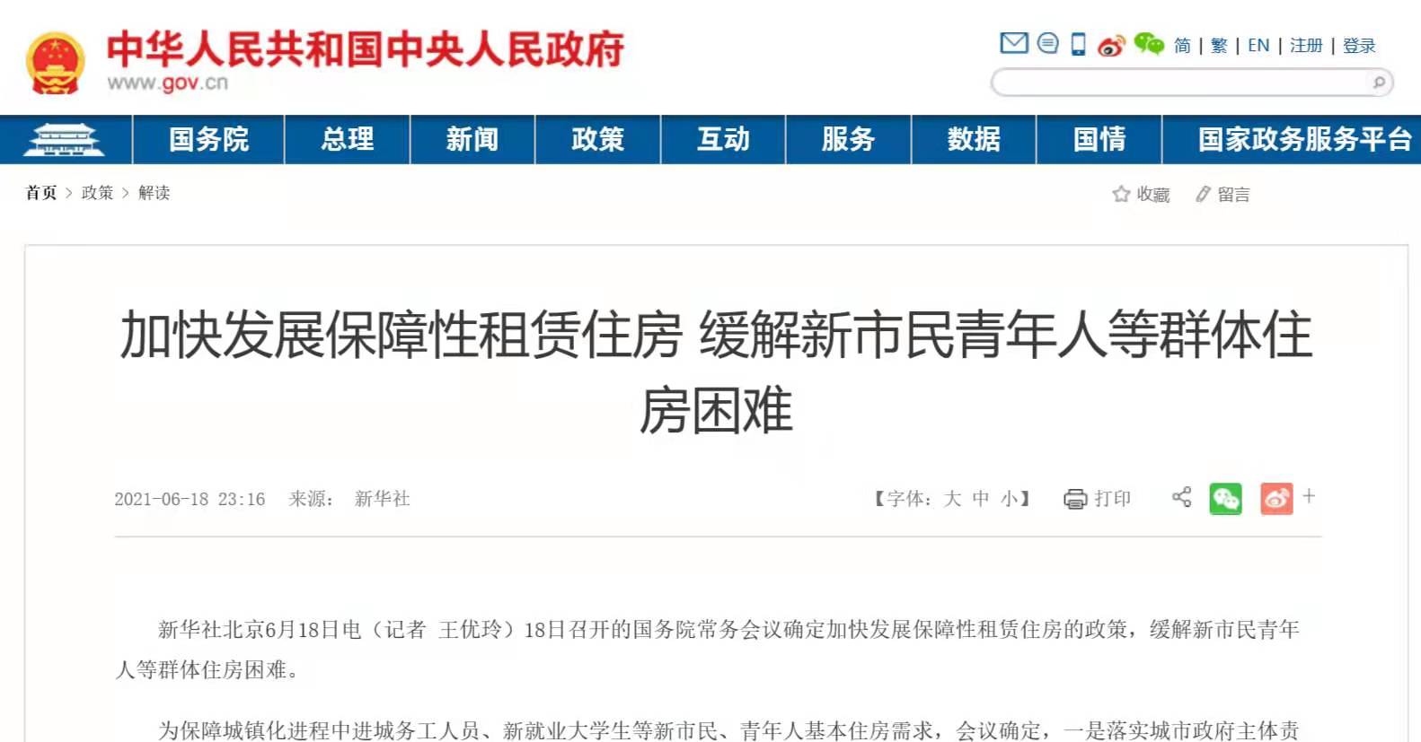 6月18日召开的国务院常务会议明确,增加租金低于市场水平的小户型保障性租赁住房供给。图片来源 中国政府网截图