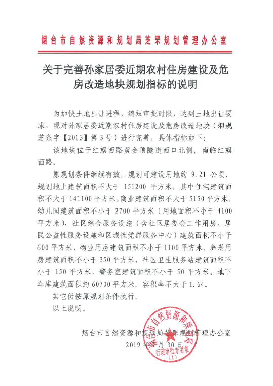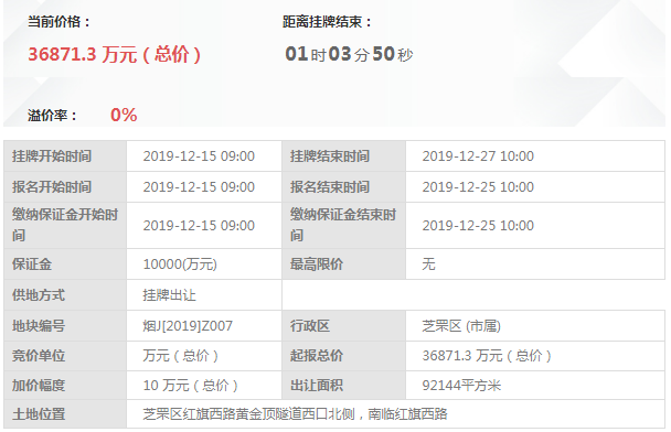 孙家棚改项目(烟J[2019]Z007)位于芝罘区红旗西路黄金顶隧道西口北侧,南临红旗西路;总出让面积为92144平方米;其起始竞拍价为36871.3万元,起始楼面价为2439元/㎡。