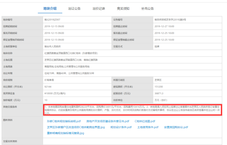 据竞买条件显示:1、本宗地需回购安置住宅建筑面积28220平方米,回购单价3691元/平方米,回购费用10416万元。2、宗地竞得人须在网上挂牌出让审查期内与芝罘区人民政府签订安置住宅提供协议,约定安置房及相关公共服务用房的交付面积、户型、交付方式、交付时间及回购价款拨付方式等相关事项,协议在出让公告发布前由区政府签署并在出让时一并公示。
