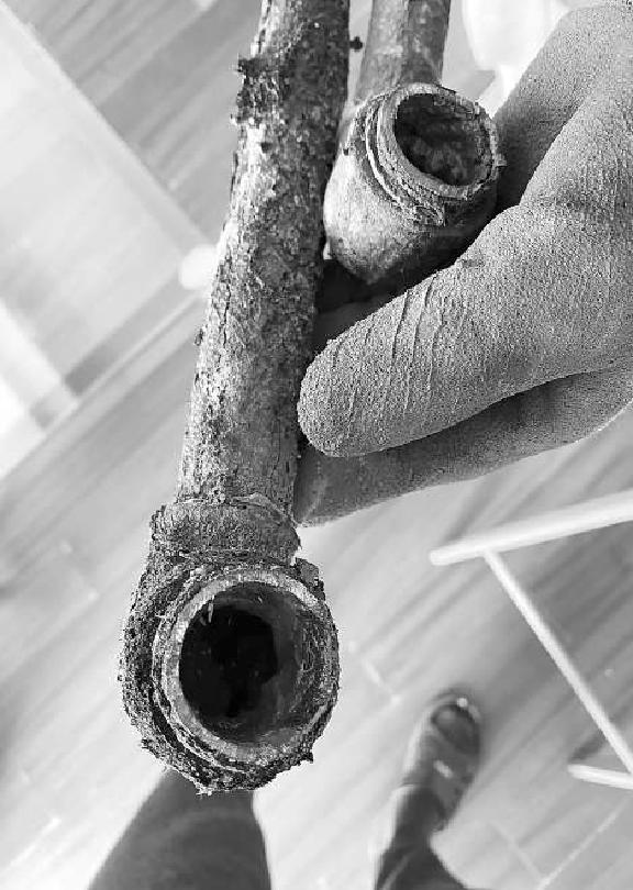 “楼上漏水泡了我们家,我们家漏水泡了楼下,这都成家常便饭了。”居民孙先生家也因为漏水问题需要换管,旧管子拆下一看,孙先生非常惊讶,这管道通体呈棕色,上面锈迹斑斑、裂纹道道,一掰就断,宛如枯树皮一般。