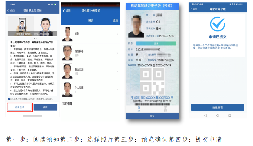 (三)使用相册的证件照片申领。对信息系统无符合要求留存照片的,除拍照方式提交电子照片外,还可以在手机相册中选择证件照片,用于申领电子驾驶证。提交证件照片后,公安机关交通管理部门将在1个工作日内进行审核,对符合要求的,“交管12123”APP将生成电子驾驶证,并推送申请成功信息。