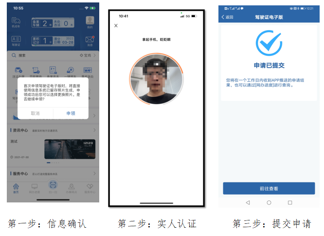 首次申领电子驾驶证时,“交管12123”APP将自动调取申请人已留存的照片作为电子驾驶证照片,电子驾驶证生成后,可以自愿选择是否更换照片。对没有留存照片的,“交管12123”APP将提示申请人通过手机拍照或者相册选择的方式提交电子照片,公安机关交通管理部门审核后,用于生成电子驾驶证。按照电子照片不同类型,申请电子驾驶证分为3种情形: