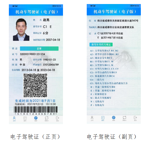电子驾驶证由正页和副页两部分组成。其中,正页主要包括驾驶证基本信息、电子证生成时间、用于验证信息的二维码和一维码等内容;副页主要包括驾驶人住址、发证机关、驾驶记录以及准驾车型代号规定等内容。主要特点有:一是统一性。通过“交管12123”APP发放,电子驾驶证式样全国统一。电子驾驶证与纸质驾驶证具有同等法律效力。二是实时性。电子驾驶证通过全国公安交管电子证照系统生成,动态显示驾驶证准驾车型变化、交通违法记分等状态,方便实时查询、实时出示、实时核验。三是安全性。电子驾驶证通过全国公安交管电子证照资源库验证比对,采用数字签名防伪技术,有效防止篡改、伪造,保证电子驾驶证真实少有、安全可靠。