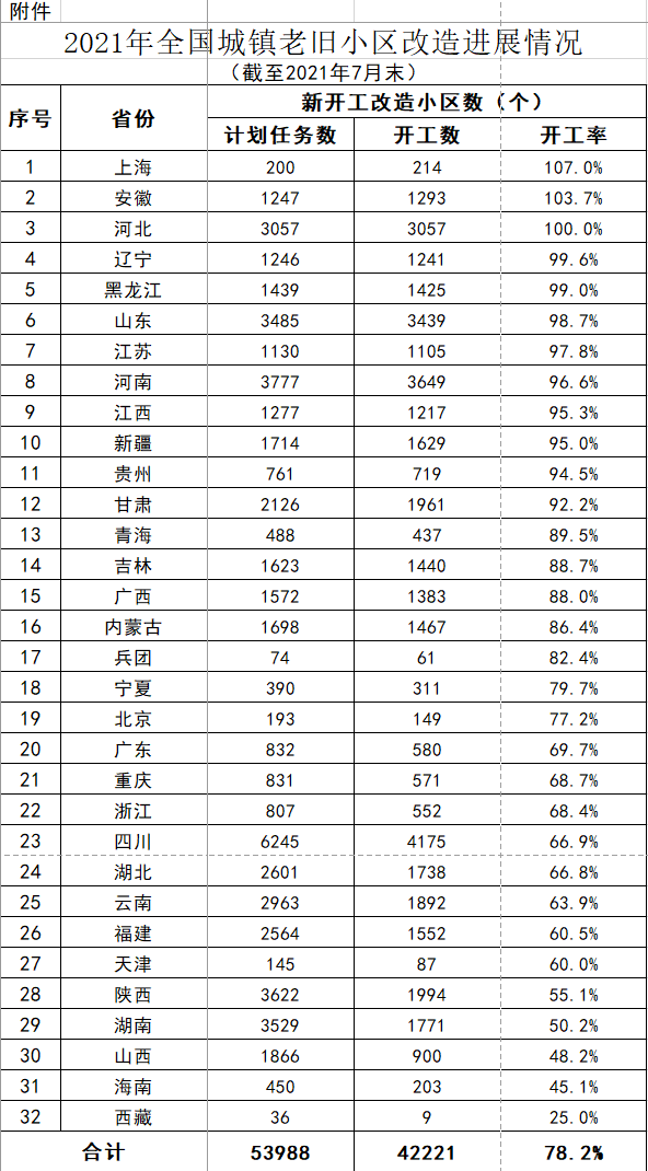 8月30日,住房和城乡建设部公告今年前7个月城镇老旧小区新开工改造情况,经汇总各地统计、上报情况,2021年1—7月份,全国新开工改造城镇老旧小区4.22万个,占年度目标任务的78.2%。较6月末增加了10.7个百分点。其中,开工进展较快的地区:上海(107.0%)、安徽(103.7%)、河北(100.0%)、辽宁(99.6%)、黑龙江(99.0%);开工进展较慢的地区:陕西(55.1%)、湖南(50.2%)、山西(48.2%)、海南(45.1%)、西藏(25.0%)。