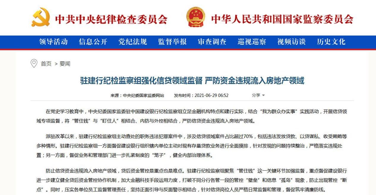 【环球网房产报道】 据中央纪委国家监委网站6月29日报道,中央纪委国家监委驻中国建设银行纪检监察组开展信贷领域专项监督,将“管住钱”与“盯住人”相结合、内防与外控相结合,严防信贷资金违规流入房地产领域。
