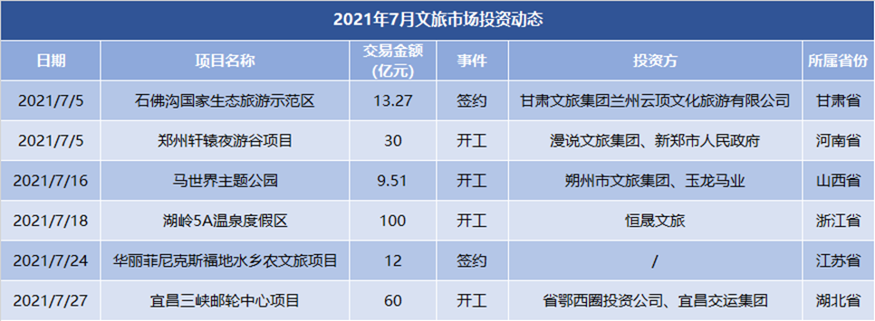 与上半年的火热不同,7月文旅投资市场稍显平静。