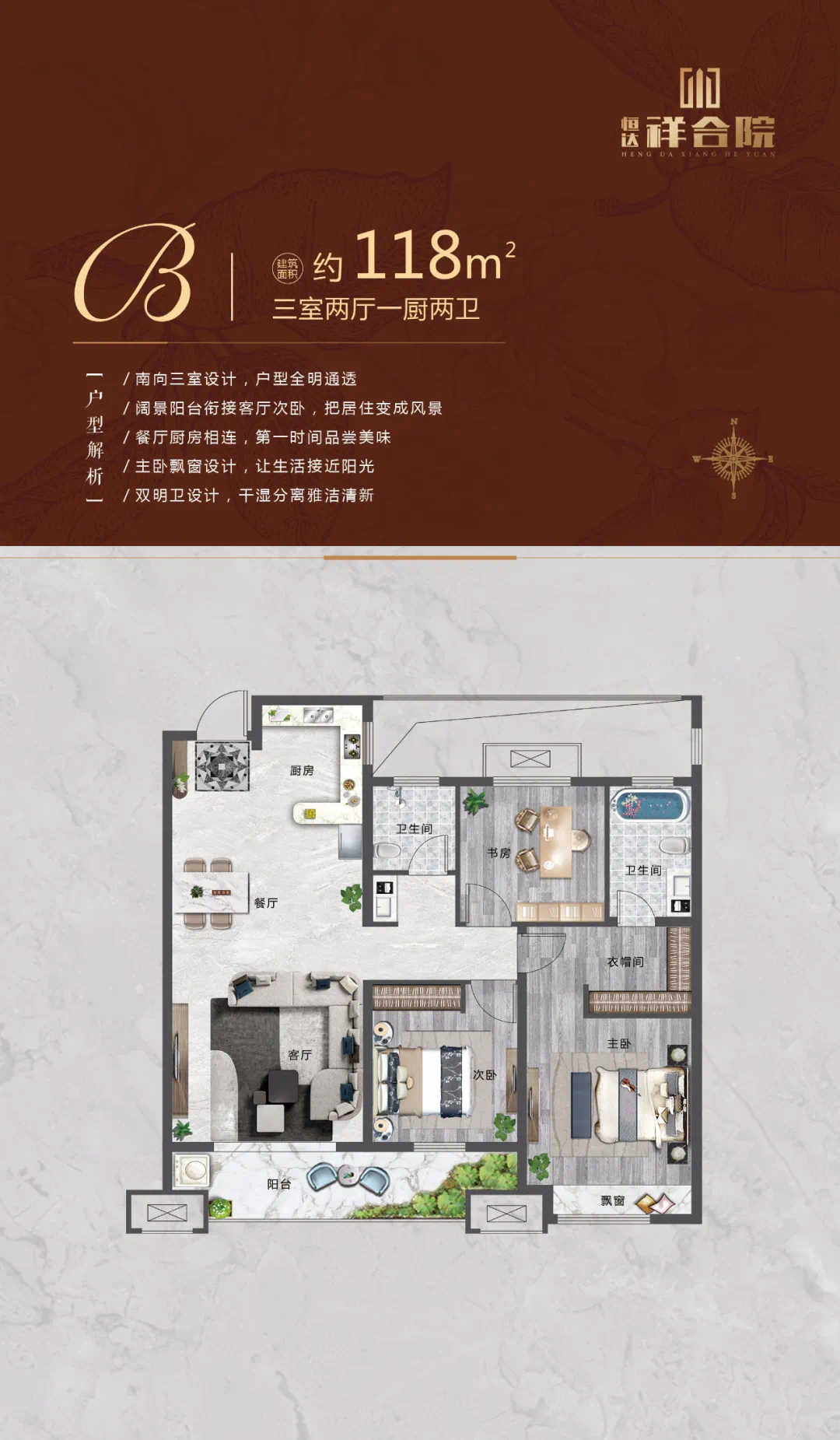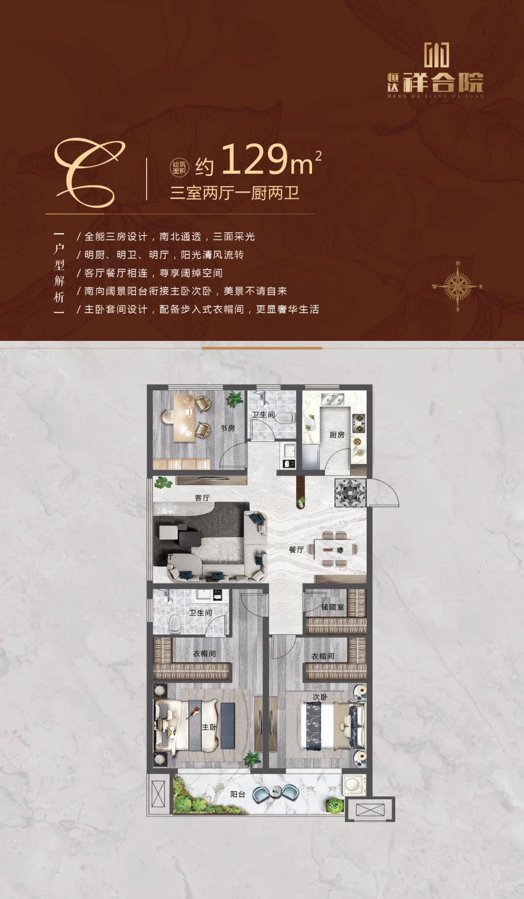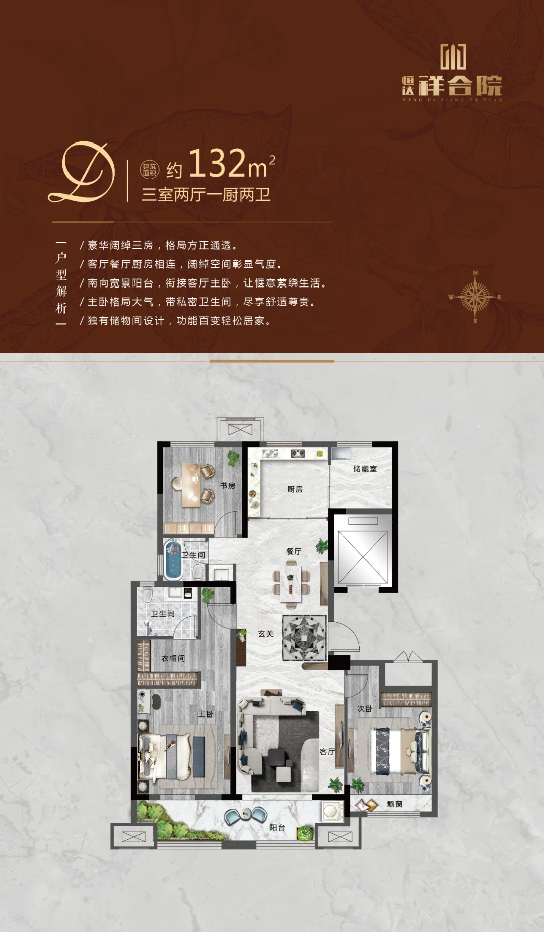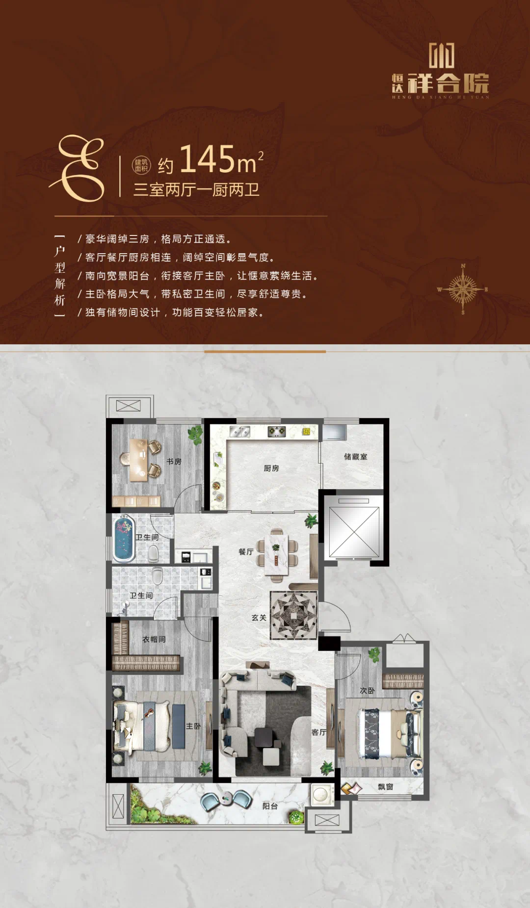 恒达·祥合院,建筑面积约145㎡的精装修大平层户型,是建筑师向阳光与生活致敬的匠心之作,南向约11米大面宽,带来视野上的尽情延展,成就真正的高端居住尺度。南北通透全明户型设计,令惬意生活在阳光满溢、清风徐徐中,自然绽放。