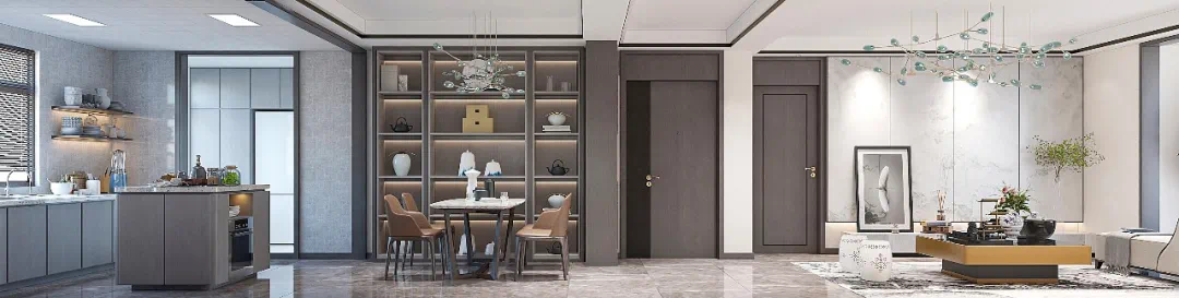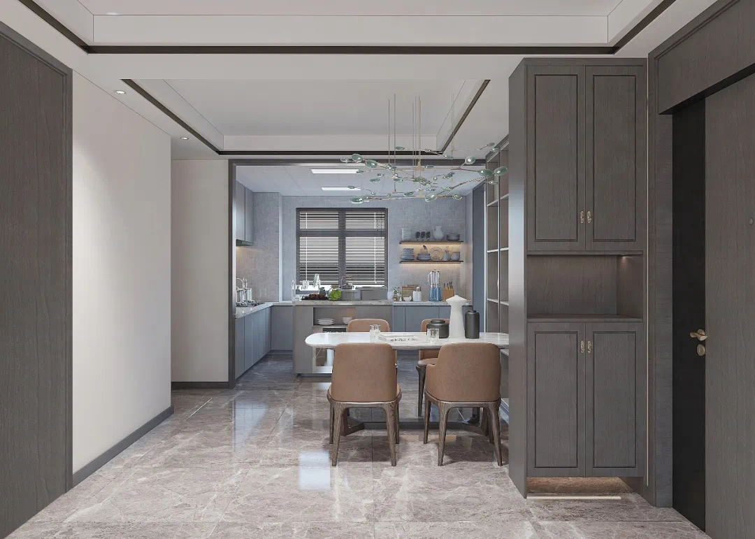 同时,厨房配备高端吊轨折叠门,令空间收缩自如,内接大开间餐厅,提供更加丰富的生活场景,可以满足家庭社交、就餐等多场景的画面切换。