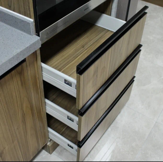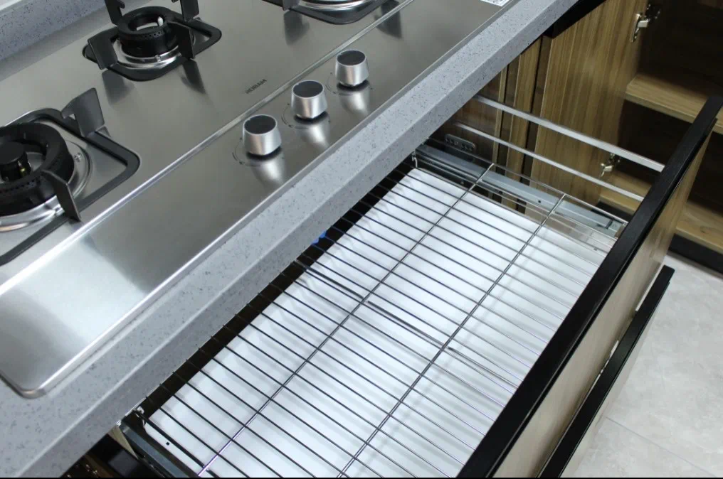 灶台下方的两个大抽屉为餐具碗碟收纳提供了充足的空间,让餐具等生活杂物井井有条。
