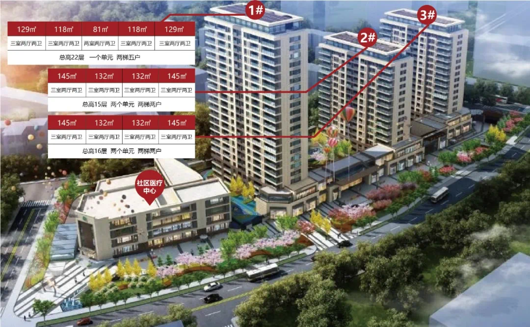 项目规划3幢美学高层,并配备一栋社区卫生医疗服务中心。1#楼 81㎡、118㎡、129㎡,总层22层,两梯五户;2#楼 132㎡、145㎡ ,总层15层,两梯两户;3#楼 132㎡、145㎡,总层16层,两梯两户。