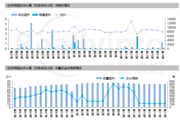 【整体市场】本周公寓市场新增供应1.29万㎡,销售0.18万㎡,成交均价8053元/㎡,去化周期升至142周