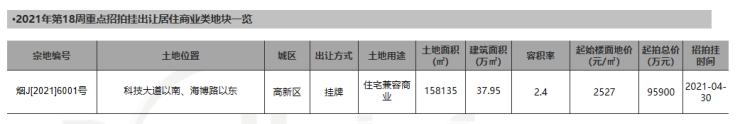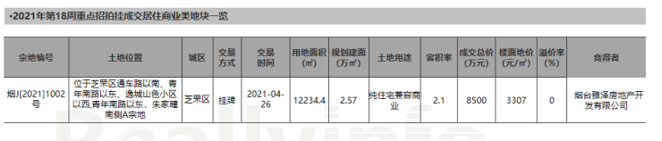 【土地成交】第18周成交土地1宗土地。烟台雅泽房地产开发有限公司拿下朱家疃南侧A宗地。
