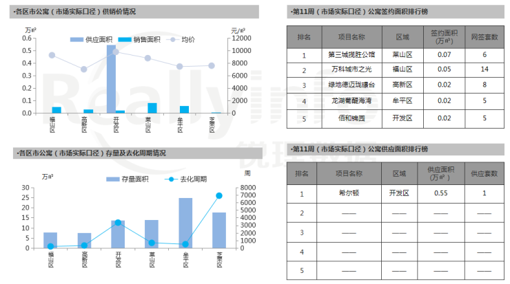 【区域市场】本周公寓市场开发区新增供应0.55万㎡;销量最多的是莱山区,其中第三城揽胜公馆项目居签约面积排行榜首位。