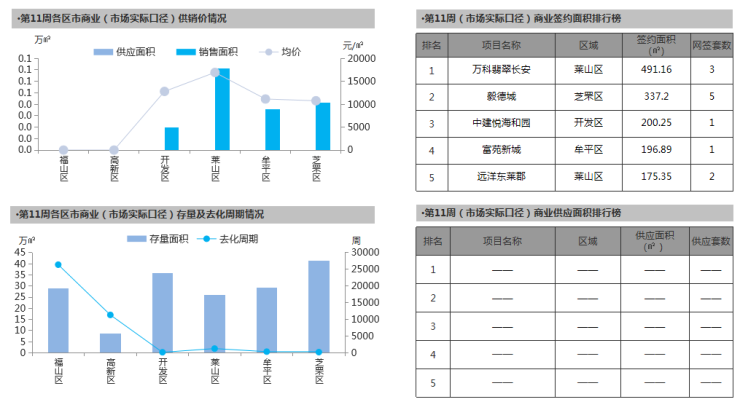 【区域市场】本周商业市场无供应;销量主要来自于莱山区;芝罘区存量较高,福山区去化周期最长;万科翡翠长安项目为周度商业市场销冠