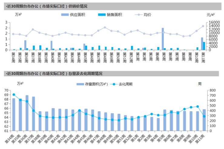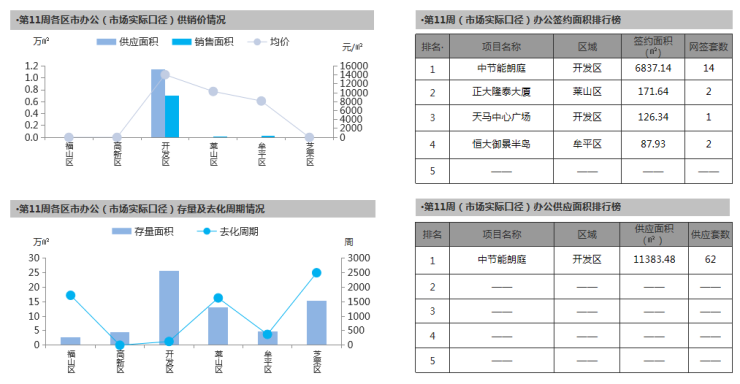 【区域市场】本周办公市场新增供应1.14万㎡;成交主要来自开发区;开发区存量较高,芝罘区去化周期最长;中节能朗庭项目为周度办公市场销冠