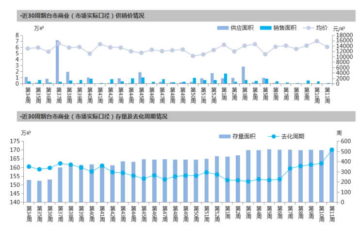 本周烟台六区商业市场无新增供应;签约18套,成交面积约0.17万㎡,成交面积环比下降58%;烟台六区签约均价13696元/㎡,环比下跌14%;截止到周末商业存量约1.21万套,面积约169.81万㎡,去化周期升至518周(约120.4个月)。