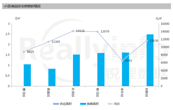 供应方面,本周无新增供应;成交方面,本周芝罘区成交最多,成交面积2.49万㎡,其次为牟平区区1.62万㎡;价格方面,开发区价格较高,为14126元/㎡;其次为莱山区13979元/㎡。
