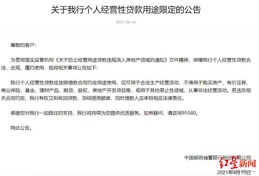 农行邮储等多家银行公告:限定经营贷用途,不得违规流入楼市