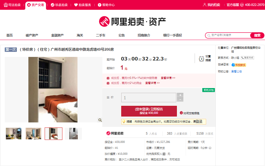 广州市越秀区龙虎墙小区的一套住宅,起拍价也只要1元。阿里拍卖网站截图