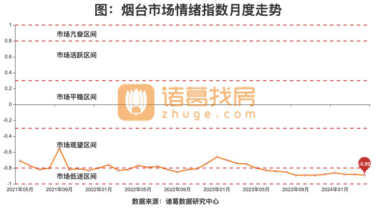 根据诸葛找房数据研究中心监测数据显示,2024年04月,烟台市场情绪指数为-0.89,较上月下降0.01,位于市场低迷区间。