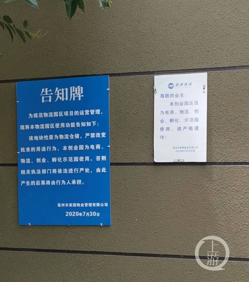 物流产业园区管委会张贴告知牌,不允许业主私改住宅。/受访者供图