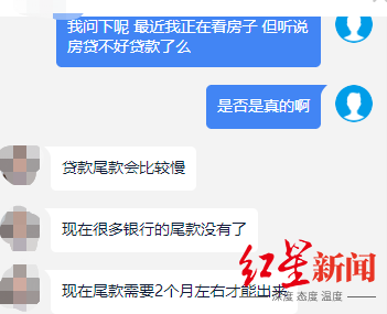 一位姓梁的人员告诉红星资本局,年尾了,银行都这样。“可以贷款,只是收尾款会比较慢。”该人员称,她所说的尾款就是没有额度的意思。“现在贷款尾款会比较慢,很多银行的尾款都没有,需要2个多月左右才能出来。”