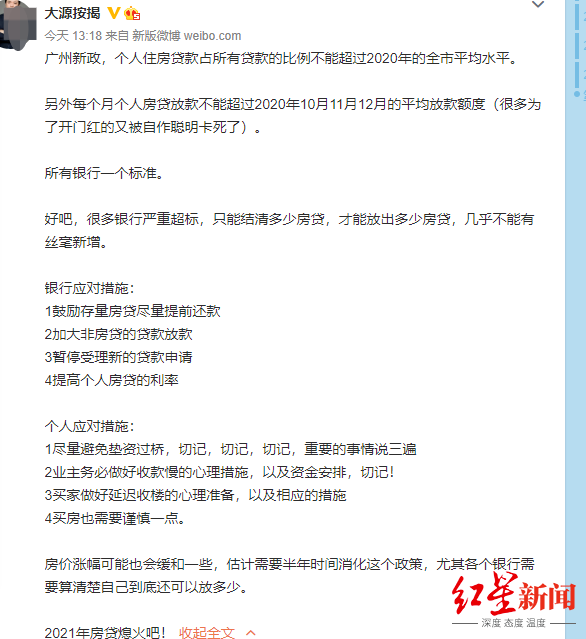 今天有大V通过微博爆料称,“广州新政,个人住房贷款占所有贷款的比例不能超过2020年的全市平均水平。”同时,该大V爆料称,在此情况下,所有银行应对的措施是“暂停受理新的贷款申请”。