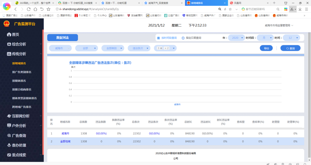 截至目前,威海市市场监管局已对22个乡镇、村庄的广告发布内容进行实地检查,检查广告内容700多条次,监测各类农村户外广告1800多条次,发现并责令改正问题广告2起,对1起涉嫌发布违法违规广告行为依法进行了立案查处。
